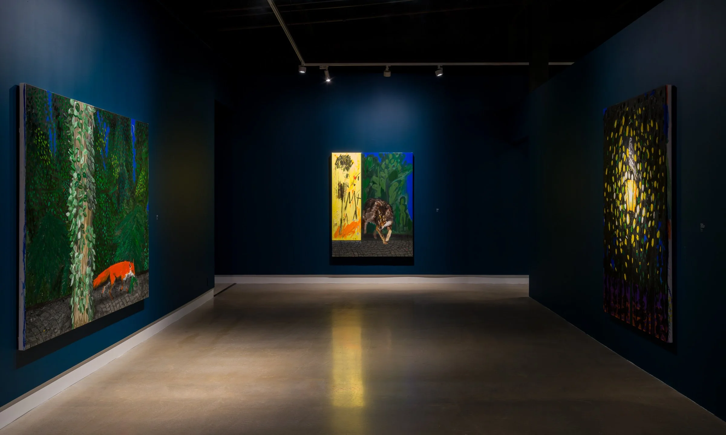 Olson’s canvases teem with narrative potential: animals stalk, waters reflect, solitary figures lie in moments of reflection or doubt. These are pauses between the familiar and the unknown that conjure the garden as a threshold—at the city’s edge or just around the corner—a surreal space between anxiety and longing.